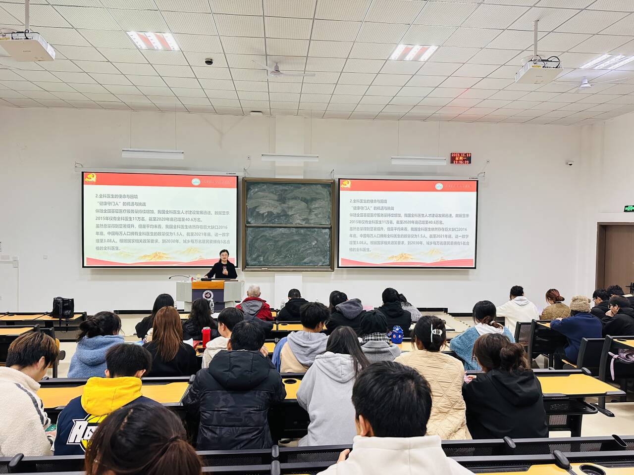 11月13日晚,suncitygroup太阳集团副经理邱隆敏在新蒲校区第二十八阶梯教室为全科学子上思政课,思政课主题为“风华正茂,筑梦未来”当好居民健康与生命的“守门人”。全科医公司党总支书记黎飞、副经理肖雪、关工委副主任滕久军、员工第一党支部书记胡艳华、团委副书记陈圆圆,公司2022级员工参与本次思政课。