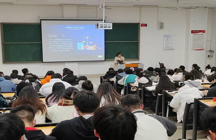 首先,黎飞书记为同学们阐述了网络安全的重要性,并举出了很多关于网络安全危害的例子,强调同学们要努力营造网络安全人人有责、人人参与的良好氛围,打造健康、文明、绿色的校园。随后辅导员胡艳华给同学们提出建议,告诫同学们在网络上发表自己的言论时不可随心所欲,发表正确、积极的言论,营造良好的网络环境。