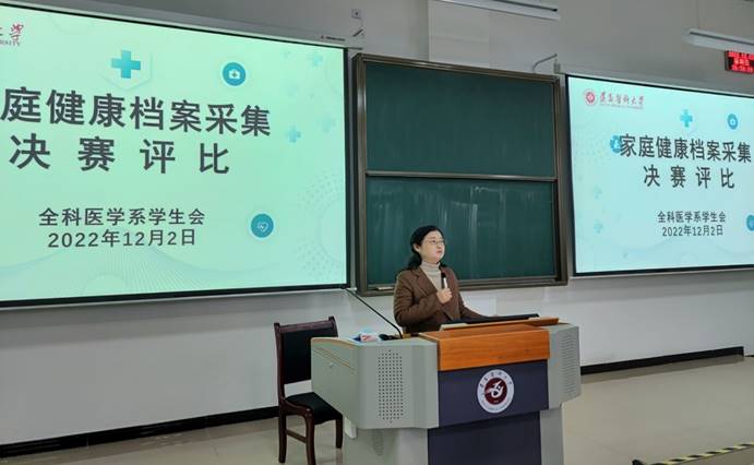 “居民健康档案采集”社会实践活动,是我系工作内容的一大特色,为了让全科医员工走向基层,了解基层,早公卫、早临床,增强全科医员工对基层医疗服务的认识与了解以及增强医疗能力,我系于12月2日在28阶梯教室举办了“家庭健康档案采集”实践活动决赛。全科医学系党总支书记黎飞、系副主任邱隆敏以及专兼职班主任出席比赛现场,全科医学系2021级、2022级全体成员以及2020级部分同学参加活动。