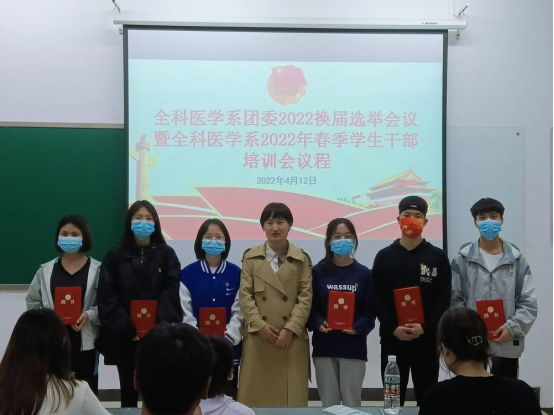 本次会议选拔出新一届的全科医学系团委各部门负责人如下,系团委副书记廖雪娥、王正成;系团委办公室主任汪明伟;系团委宣传部部长姬登欢;系团委组织部部长赛雪妮;系团委社会实践部部长何海燕。会议还对上一届优秀工作者进行表彰,并颁发证书、合照留念。
