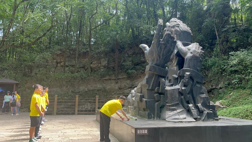 在“抗争”握拳石像前,队员们带上鲜花缅怀革命先烈,回顾中国革命的光荣历史,学习“坚定信念、艰苦奋斗、实事求是、敢闯新路,依靠群众、勇于胜利”的共产党人精神。