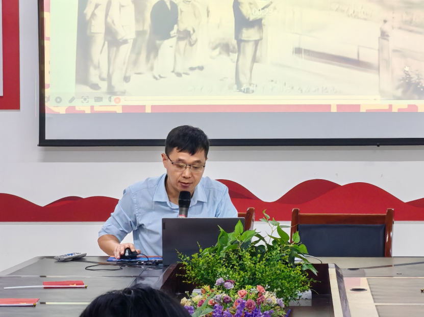 全体参会人员齐唱《歌唱祖国》,拉开会议序幕。李彦虎老师以“国庆记忆”为切入点,结合《中华人民共和国简史》等党史资料,重点围绕天安门宣言、人民英雄纪念碑、五星红旗展开阐述,详解宣言形成及意义、纪念碑建设背景与象征、国旗设计理念与诞生历程,并结合国庆阅兵场景,以历史事件、纪念符号、仪式画面结合的方式,直观呈现党领导人民探索社会主义、推进现代化的历程,揭示中国式现代化的历史逻辑与国情根基。