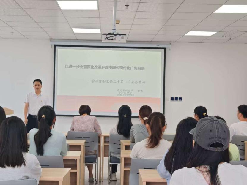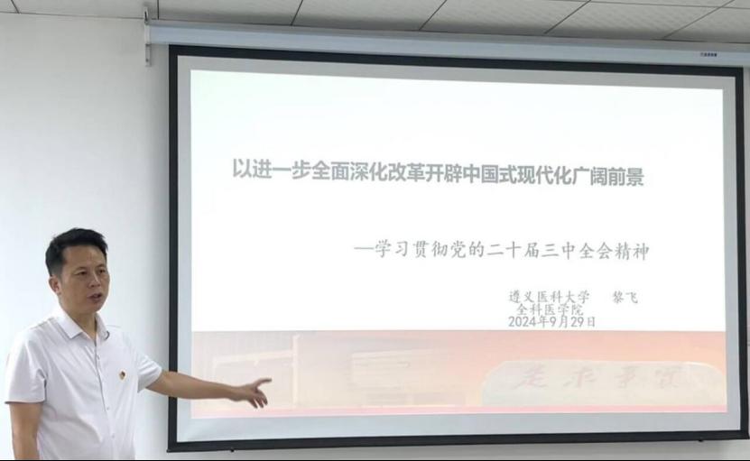 为全面深入学习领会党的二十届三中全会精神,9月29日上午10:00,全科医公司党总支书记黎飞以“进一步全面深化改革 开辟中国式现代化广阔前景”为题,在党员师生、团学干部中开展党的二十届三中全会精神的专题宣讲。员工党支部书记、员工入党积极分子、各团支部书记、员工干部等60多人与会。宣讲会由公司团委副书记陈圆圆主持。